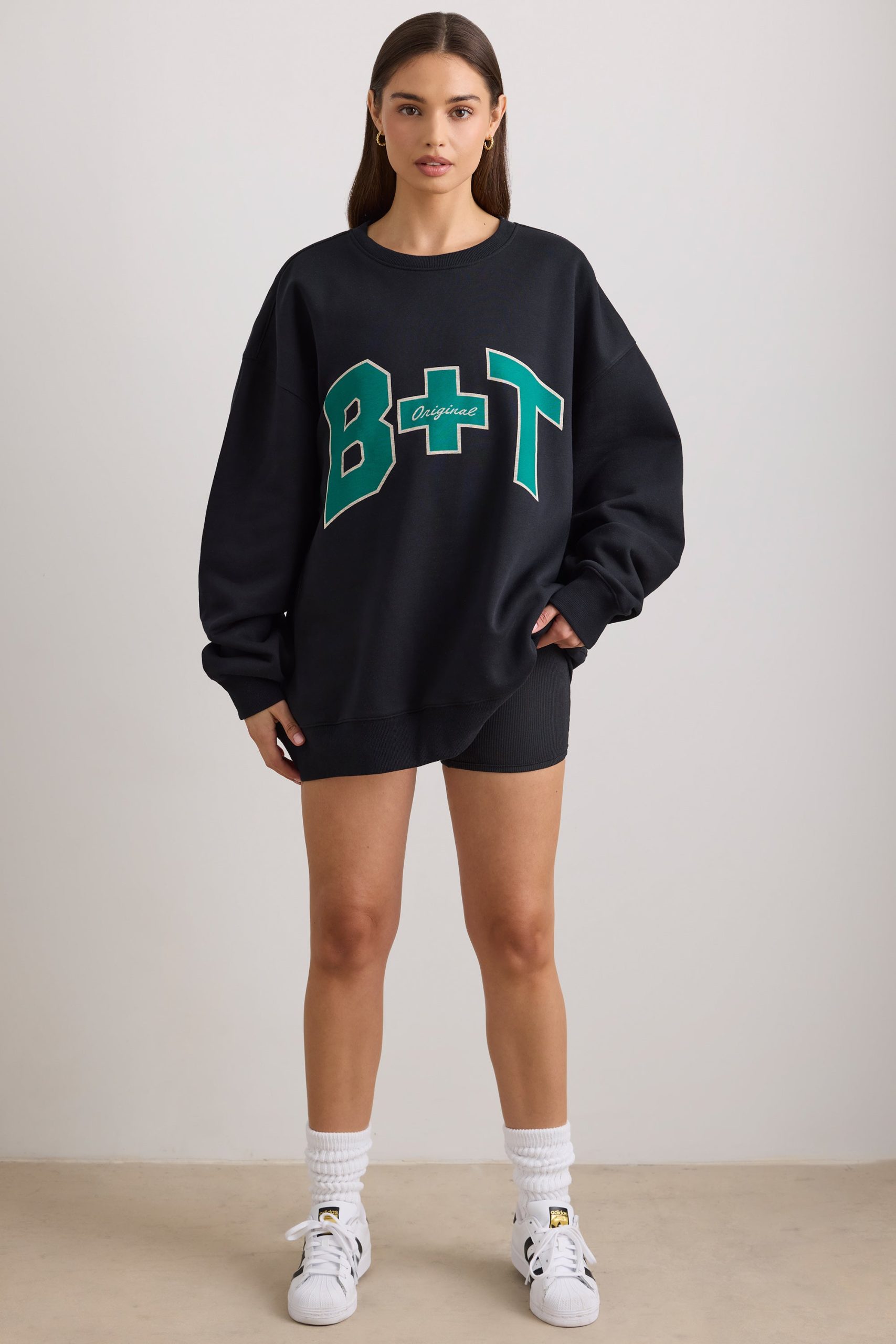 Effortless, laidback comfort. Designed in our premium cotton fabric with an ultra-soft fleece lining, our classic crew neck sweater has a retro-inspired design with dropped shoulders and oversized sleeves. Bo+Tee’s relaxed sweatshirt is complete with statement branding across the chest as well as thick, ribbed detailing on the neckline, hem, and cuffs.