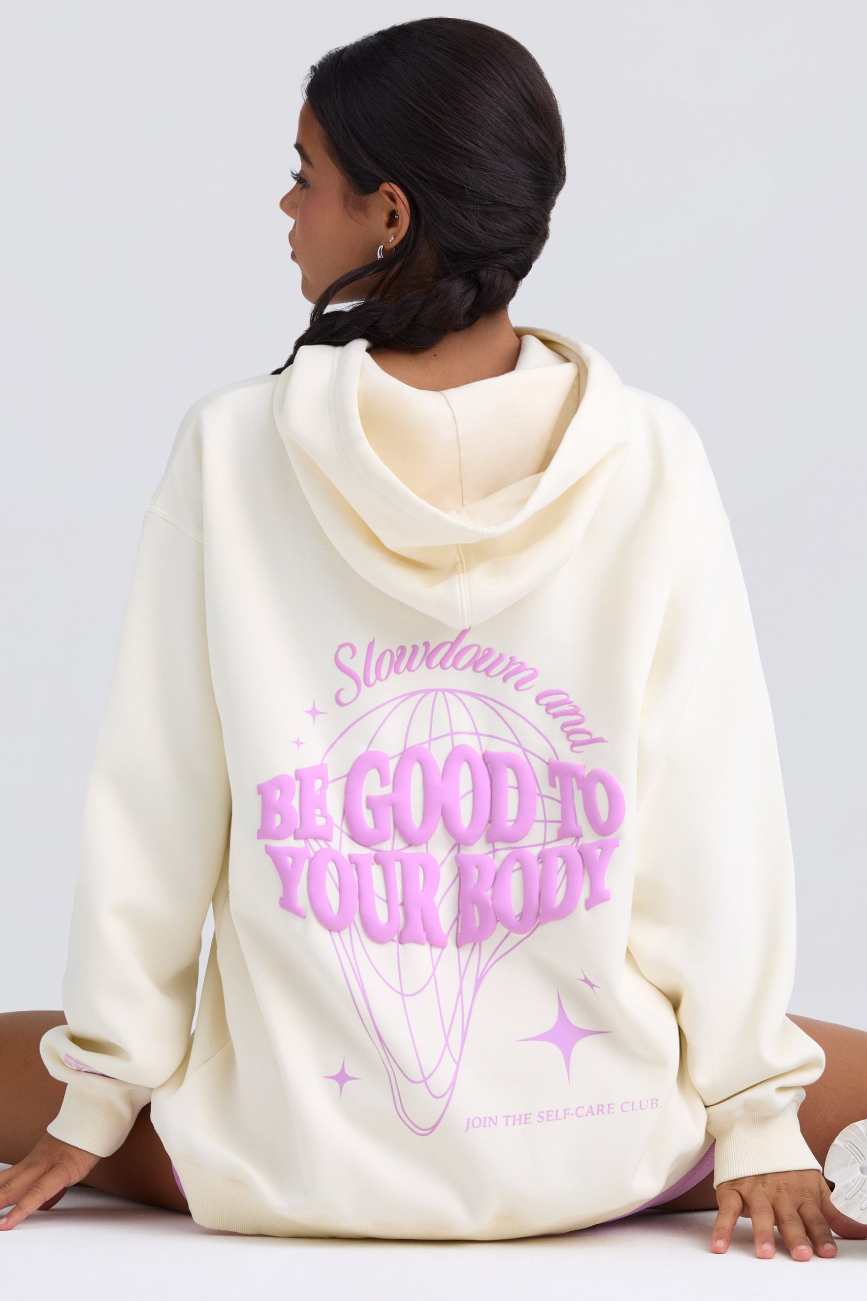 Morning mantras. A reminder to practice self-care every day, this hoodie is saturated with contrasting custom-developed graphics. It’s crafted from super soft, heavyweight fleece with a brushed finish and cut to a signature oversized fit with a ribbed hem and cuffs. It’s complete with an adjustable drawstring hood and kangaroo pocket.