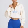 Designed with morning coffee runs and active afternoons in mind, this cropped sweatshirt is crafted from soft and slouchy scuba jersey with dropped shoulders and ribbed cuffs that enhance the laid-back look. It features an adjustable drawstring hem for custom styling, a quarter-zip fastening at the front and an embroidered Bo&Tee logo at the chest.