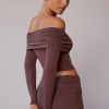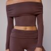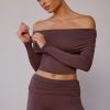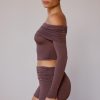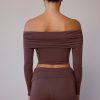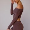 Set the barre. Crafted from soft, lightweight, and sheer stretch jersey, this top is the perfect off-duty layering piece to take you from the workout studio to brunch. It’s cut to an off-shoulder silhouette, framed with a fold-over ruched neckline, and finished with a woven Bo&Tee logo badge.