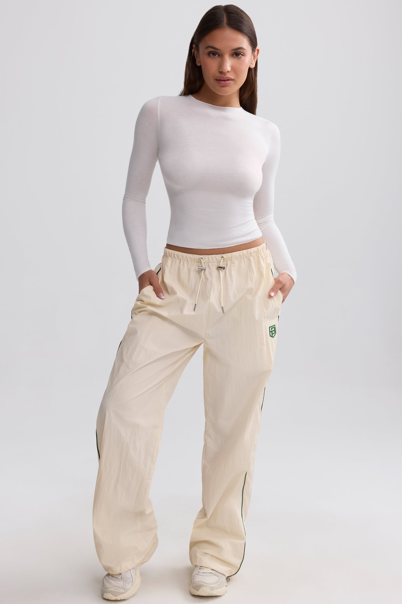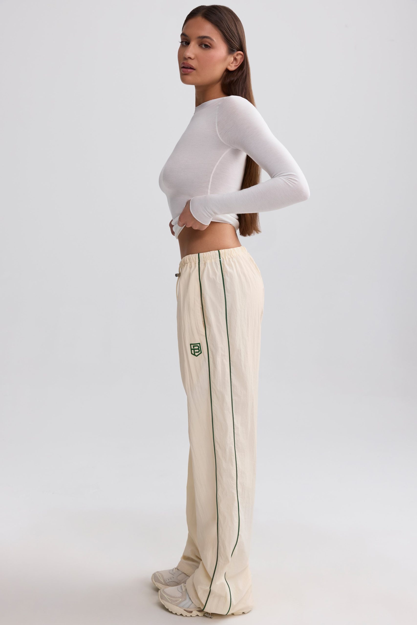 Game-changing separates. Designed for transitional styling, these lightly crinkled track pants are crafted from lightweight and water-repellent nylon to an oversized wide-leg silhouette. They’re set on an elasticated drawstring waistband for a custom fit and feature two practical side pockets. The elasticated hems and contrast piping detail at each side cement the sporty inspiration.