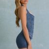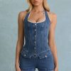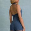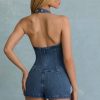 Denim, done our way. Perfect for day-to-night summer styling, the Lalita playsuit is crafted from our premium denim with a touch of stretch for enhanced comfort. Cut to a halterneck silhouette, it features a square neck traced with contrasting lace, decorative flap pockets and precise panelling that creates a contoured, cinched look.