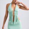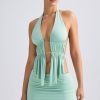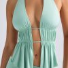 Tactile textures and unique details. A statement twist on classic halterneck styles, the Larisa top is crafted from soft sheer jersey to an asymmetric silhouette with an open front, secured with minimal strap detailing and enhanced with ruched panels that fall to a waterfall hem. The open-back is finished with symmetrical adjustable straps for a custom fit.