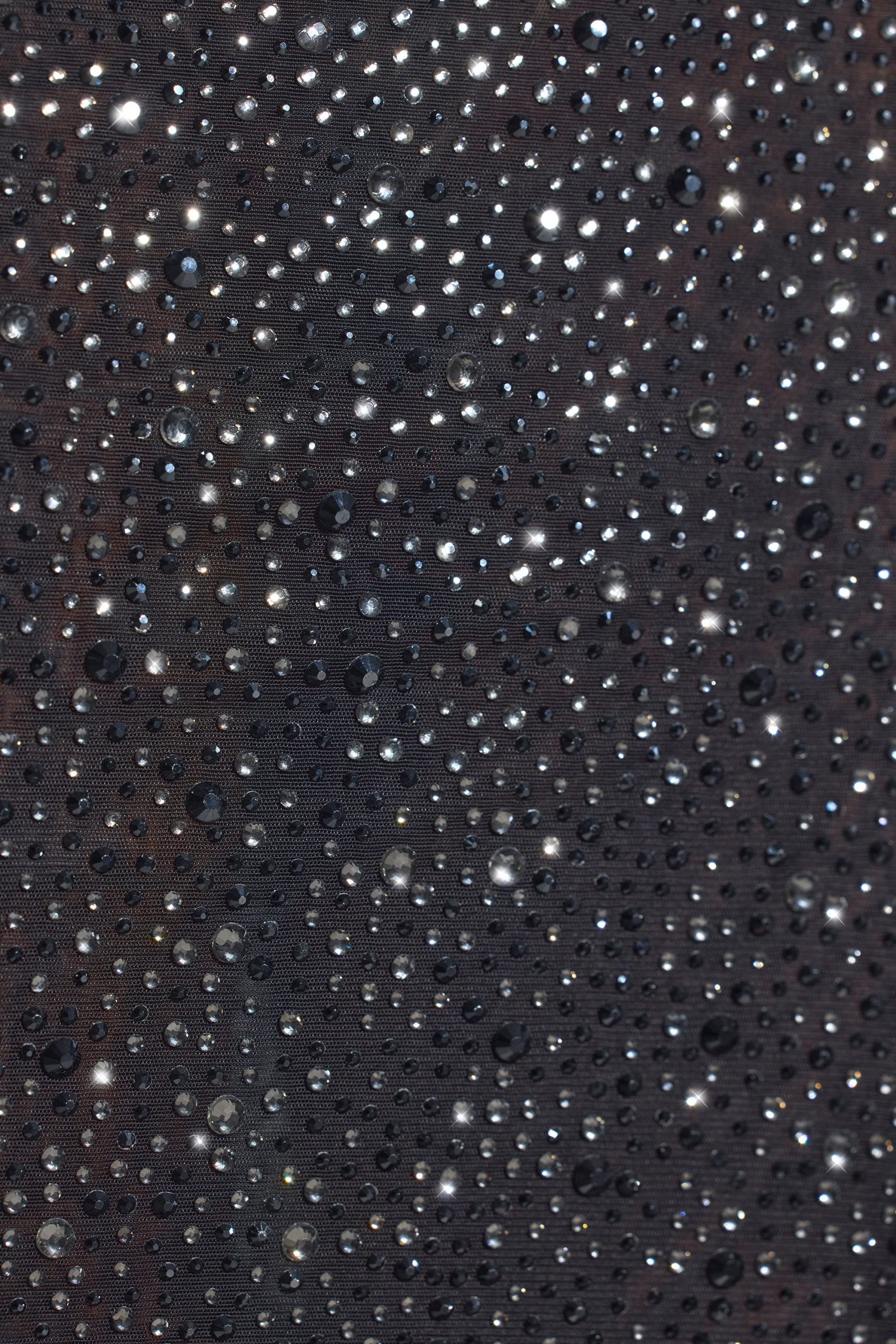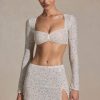 Sparkling staples. Designed to be styled with the coordinating maxi skirt from the collection, the Lumina crop top is crafted from premium 20D stretch mesh to a striking cropped silhouette, complete with ruched detailing at the front. It’s framed with long fitted sleeves and adorned with signature tonal HOTFIX embellishments that glitter under the light.