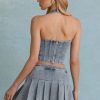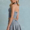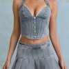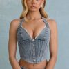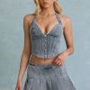 Denim you’ll adore. The perfect corset for your rotation, the Lotta top is crafted from premium stretch denim to a halterneck silhouette with a curved hem and perfectly placed panels that create a sculpting effect. It’s framed with a plunging V-neck, contrasting lace trim and decorative metal hardware button detailing at the front.