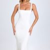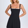 Playful silhouettes for sun-kissed days. In keeping with the romantic aesthetic of the collection, the Aubrielle mini dress is traced with a picot lace trim at the neckline and hem. It’s crafted from figure-hugging stretch georgette and cut to a universally flattering A-line silhouette, complete with adjustable rouleau tie shoulder straps and a delicate bow embellishment at the front.