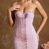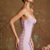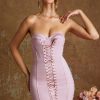 Inspired by romantic boudoir styling, the Emira mini dress is a stand out style in our latest collection. Cut from our premium satin fabric in two amorous colourways, Emira is a bandeau mini dress with exposed balcony cups overlaid with a deconstructed, lace up corset. Lace up ribbon detailing accentuates the front and sides of this glamorous evening dress with satin ribbon ties fastening at the hem of the dress.