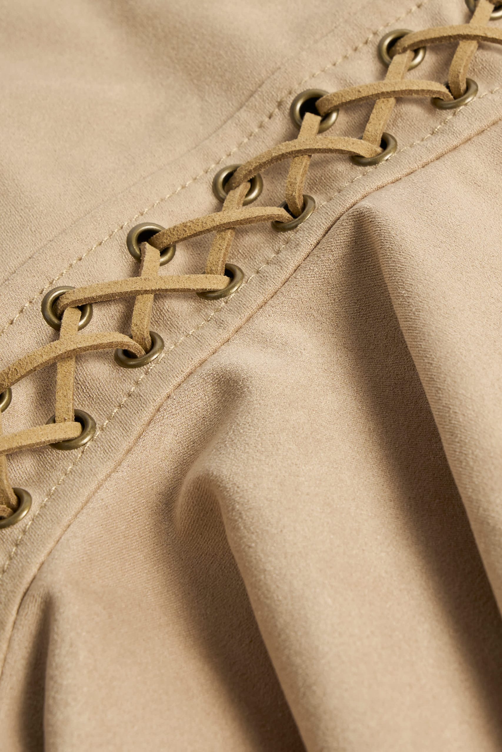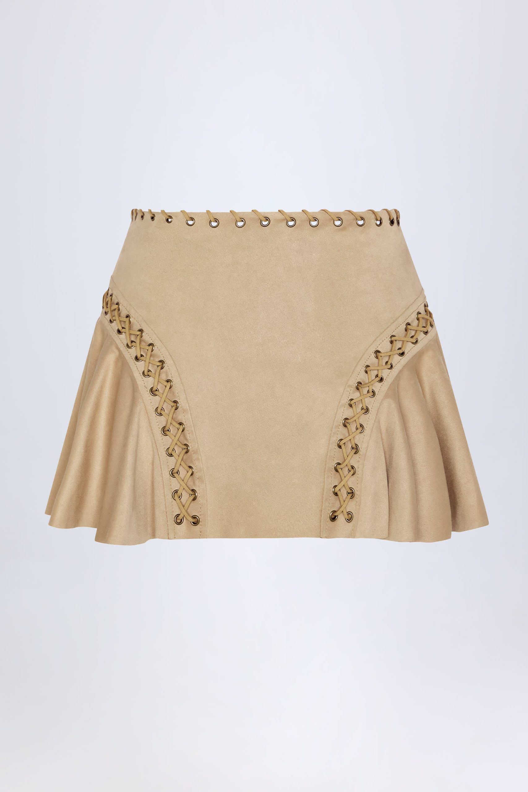 Fusing country influences with effortless glamour, the Jalsa mini skirt is elevated with decorative eyelets and contrasting lace-up detailing, inspired by a classic Western aesthetic. It’s crafted from soft-touch faux suede to a universally flattering mid-rise silhouette and features flared side panels for added movement.