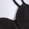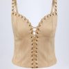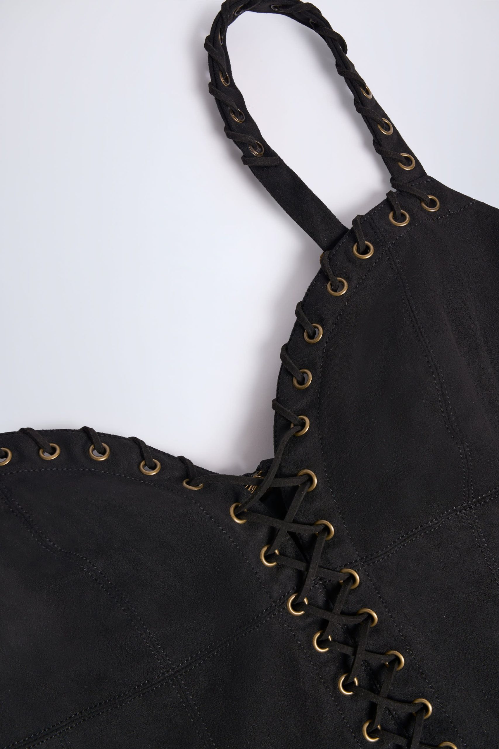 Country influences meet signature glamour with the Bela top. Crafted from soft-touch faux suede to a figure-hugging silhouette, it’s brought to life with tonal topstitching, decorative eyelets and contrasting lace-up details. It’s framed with a plunging neckline and features wide adjustable shoulder straps for a custom fit.