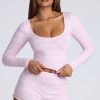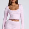The Loungewear crop top is the perfect piece for relaxing at home. Cut close to the body and designed in our lightweight, stretchy pointelle jersey, the Loungewear crop top features all-over embossed Oh Polly branding. With a flattering scoop neck, long sleeves, and pretty lettuce hem edging, this is the lounge essential you’ll love throughout the cozy season.