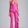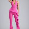 Playful separates with a whimsical twist. Available in two striking hues, the Reese flared trousers are a bold foundation for festival looks. Designed in our premium 20D stretch-mesh fabric with a glossy metallic coating, they’re cut to a low-rise silhouette and adorned with a waterfall ruffle trim at one side.
