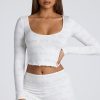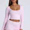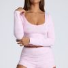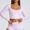 You’ll never want to take off our fun and flattering Loungewear. Cut from our lightweight and stretchy pointelle jersey fabric, the Loungewear mini shorts feature Oh Polly embossed branding throughout. Your go-to for cosy days at home, this snug wardrobe staple is complete with a mid-rise waistband and pretty lettuce hem edging.