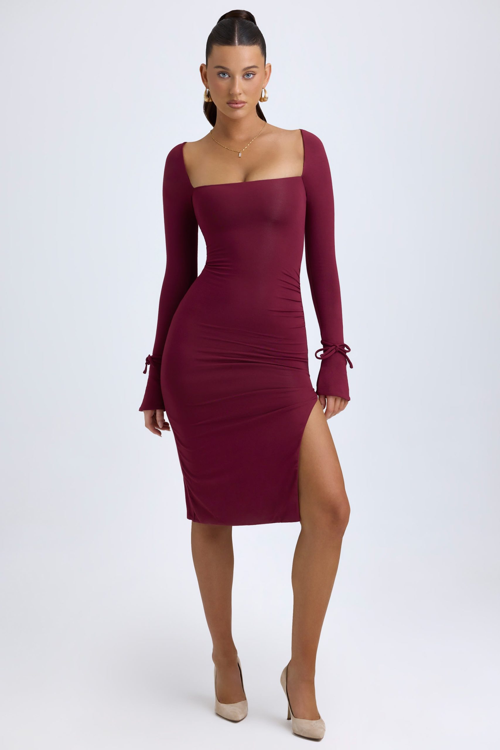 Sleek and sophisticated, the Sawyer midi dress is the ultimate year-round styling piece, crafted from buttery soft and stretchy jersey made with TENCEL™ Modal fibres, derived from controlled or certified wood sources. It’s cut to a figure-enhancing bodycon silhouette framed with a square neckline, flared sleeves with tonal ties and a curved cut-out at the back.