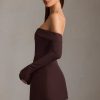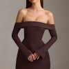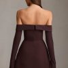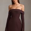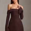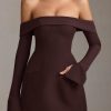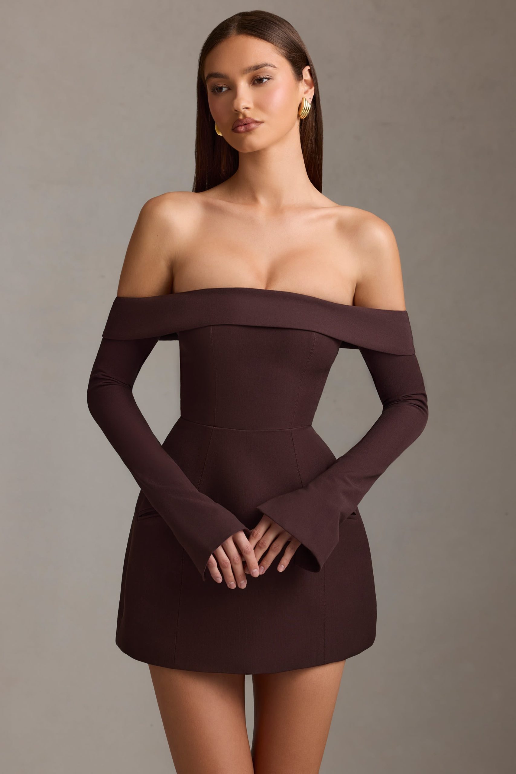Off-Shoulder Structured A-Line Mini Dress in Chocolate Brown