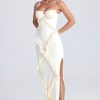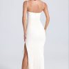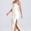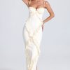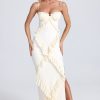 Ethereal silhouettes. Designed to elevate your occasionwear rotation, the Kazumi maxi dress is crafted from lightweight georgette and adorned with intricate plissé ruffle trims and cups that create a stunning three-dimensional effect. It’s cut to a classic column silhouette, punctuated with a side split, and framed with a whimsical sweetheart neckline.