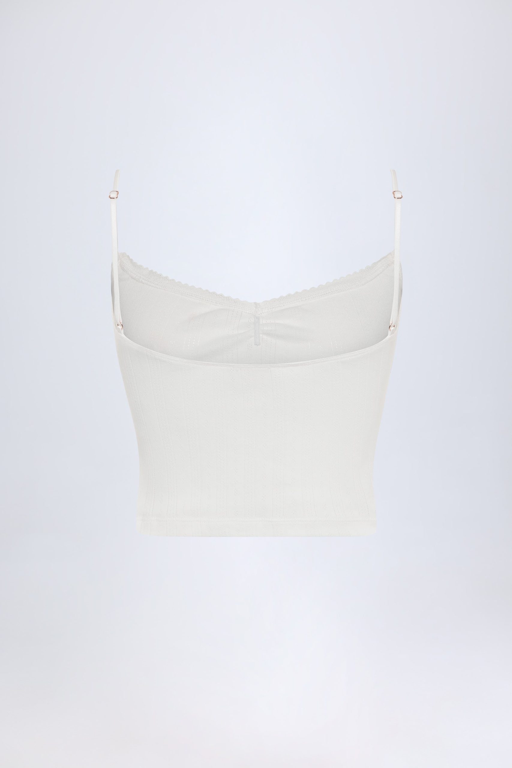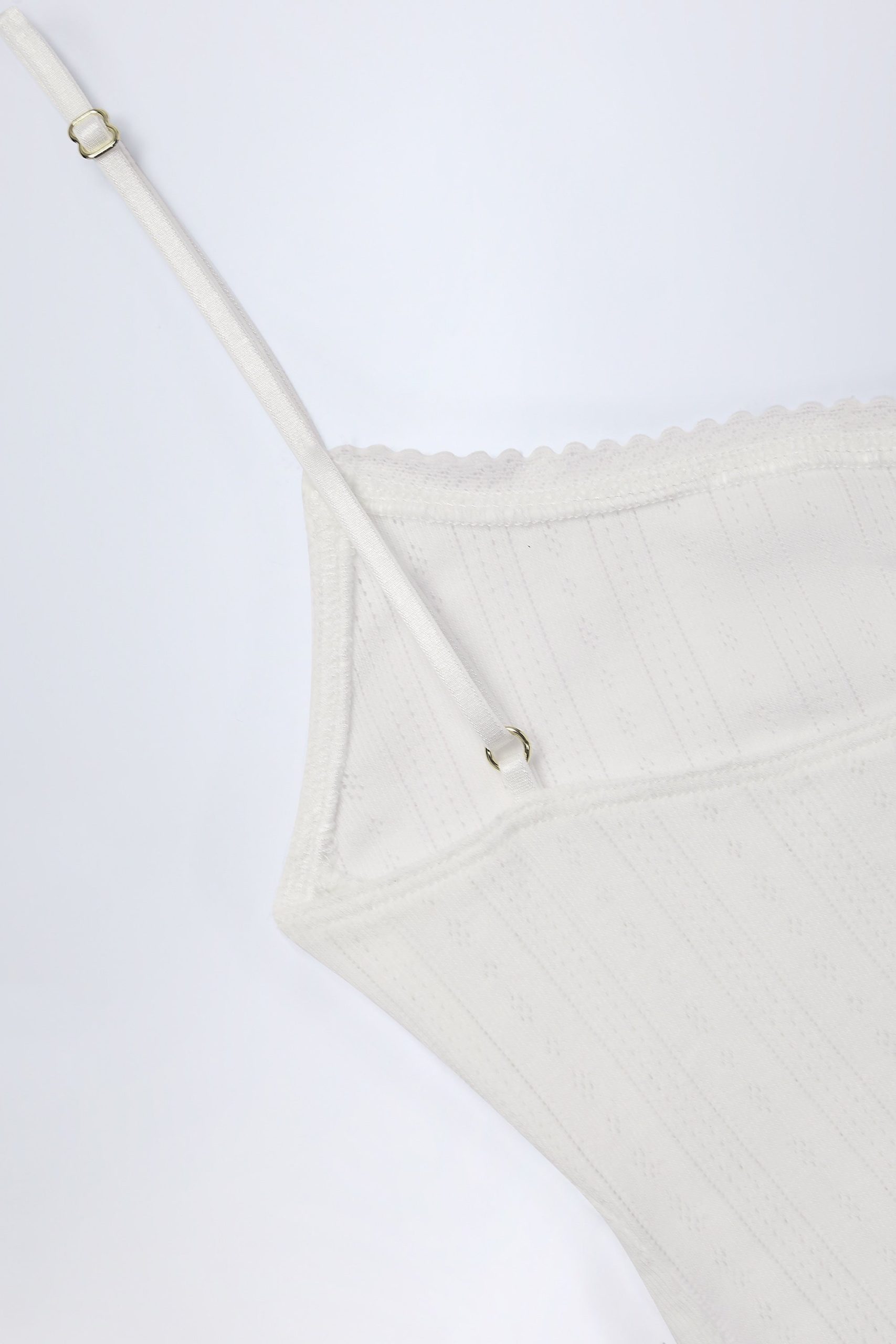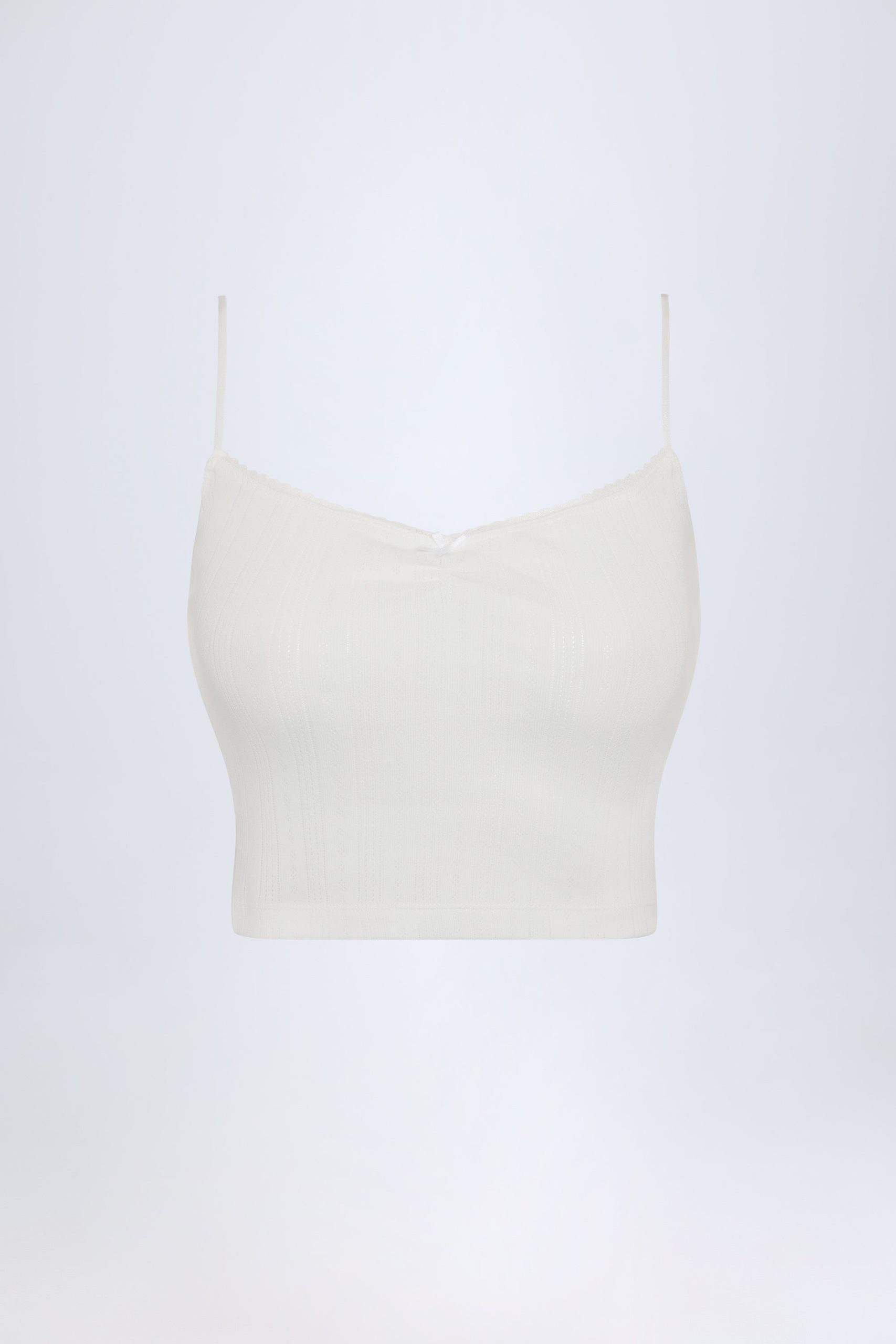 Pairs perfectly with slow mornings. Lightweight, breathable and oh-so soft, the Livia crop top is crafted from cotton jersey with a delicate pointelle texture for easy styling with the coordinating trousers. It’s cut to a classic camisole silhouette with a sweetheart neckline, framed with a pretty lace picot trim, light ruching at the bust, and a tonal bow embellishment.