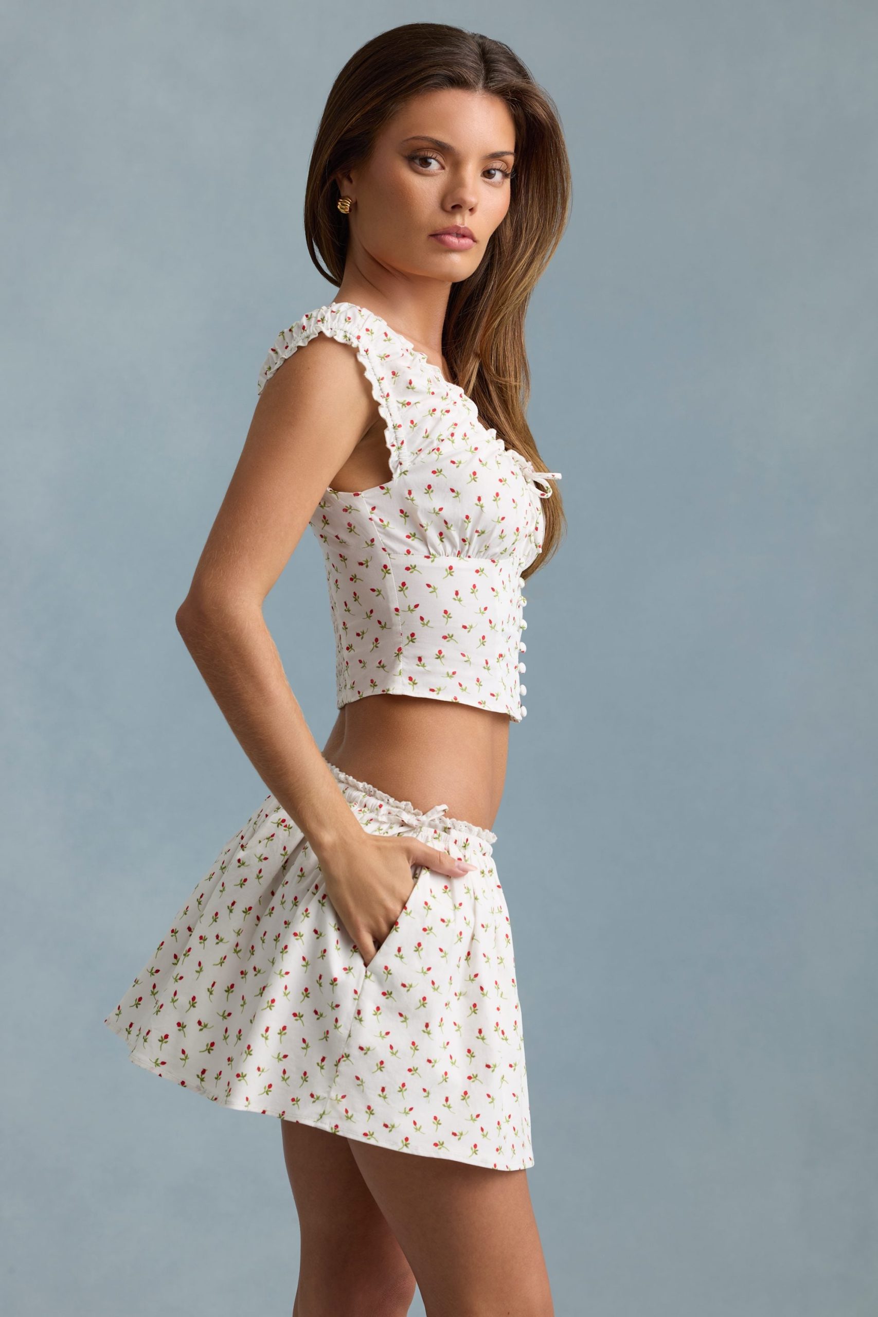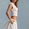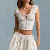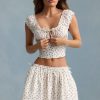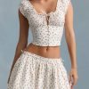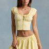 Sweet escapes and storybook days. A new favourite, the Faela corset top is crafted from stretch-cotton poplin to a figure-hugging silhouette with adjustable tie detailing and decorative fabric-covered buttons, inspired by classic styles. The shirred cap sleeves can be worn on or off the shoulder.