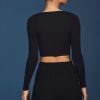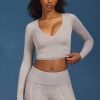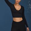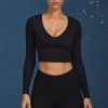 Layering staples. The perfect styling piece in your year-round rotation, this long-sleeve crop top is made from soft-touch, stretchy jersey and cut to a V-neck silhouette. It’s elevated with ruched detailing at the sleeves and sides for all-day comfort.
