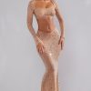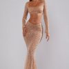 Catch the light. Designed in premium single layer stretch mesh fabric that hugs your silhouette for a curve-enhancing fit, Chiara is a maxi length design, fully hand embellished with delicate artisanal hotfix. Created to captivate, this sexy almond evening skirt is complete with a waist-cinching V-waistline and a subtle flared hemline.