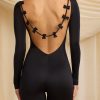 Love effortless glam outfits? Look no further than our Eulalie jumpsuit, crafted from our signature slinky jersey with the perfect amount of stretch for a figure-hugging fit, it’s cut to a universally flattering straight-leg silhouette. The statement open back is elevated with a row of custom-made draped bow embellishments because the little details are everything.