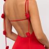 a sweetheart neckline with ruching at the bust, a low back, and delicate shoulder straps which feature rose detailing.