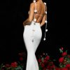 a sweetheart neckline with ruching at the bust, a low back, and delicate shoulder straps which feature rose detailing.