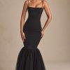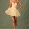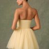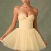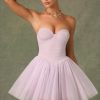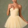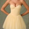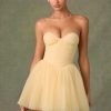 Ethereal and timeless, the Dottie mini dress is crafted from layers of frothy tulle with a fitted corset bodice complete with wired cups and detachable, adjustable straps for enhanced support. It’s enhanced with expert ruching and a V-shaped waist that creates a sculpted look before flaring to a full, voluminous layered skirt.