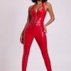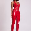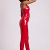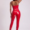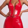 Vinyl Halter Neck Lace Up Corset Crop Top in Fire Red