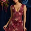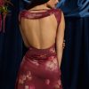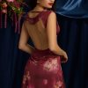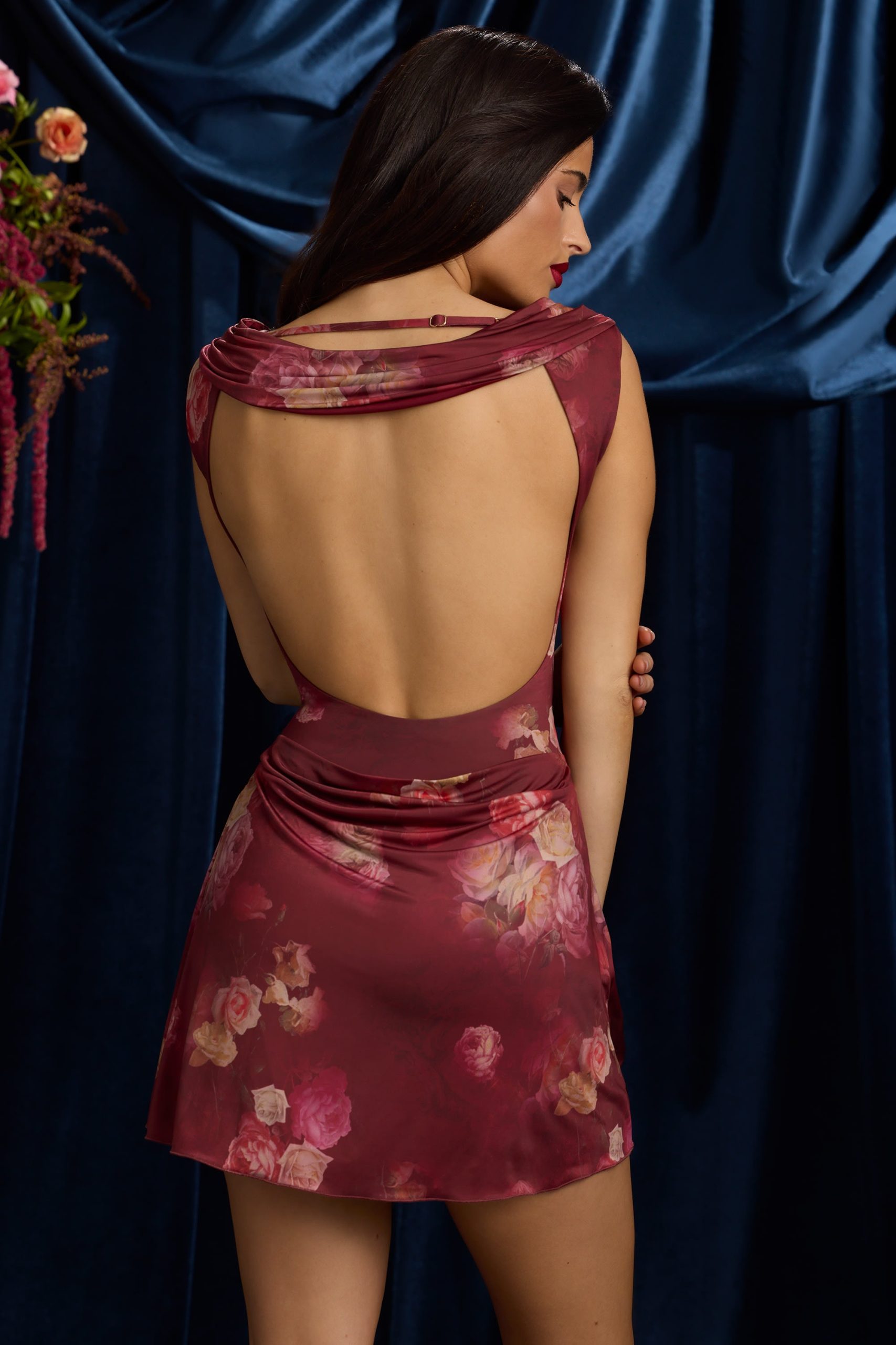 Draped Open-Back A-Line Mini Dress in Maroon Floral Print