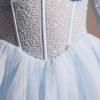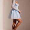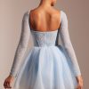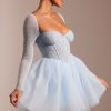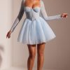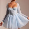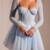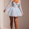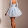Ethereal romance. Designed in two soft pastel shades, the Calliope mini dress works to sculpt and enhance your silhouette. With a delicately hand embellished angled corset and single layer mesh long sleeves, Calliope is complete with an elegant full tulle skirt.