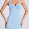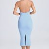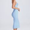 Classic silhouettes, head-turning details. Inspired by artisanal elements, the Ulanni midaxi dress is a unique take on a timeless style, adorned with tonal hand-applied ruffle appliqués at the bust. It’s crafted from stretchy sheer jersey to a halterneck bodycon silhouette with flattering princess seams that create a sculpted look. It turns to reveal a low open back and features a centre-back split.
