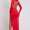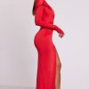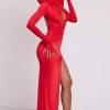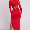Vampy glamour. Designed in our premium jersey fabrication that’s super soft and stretchy, the Desdemona maxi dress features tight cut long sleeves and a hood. A bodycon design with draped bodice and low open back, this standout maxi dress is complete with a sexy thigh-high split.