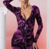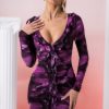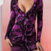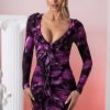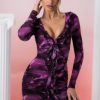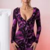 Long Sleeve Ruffle Detail Mini Dress in Multi Print