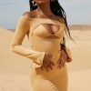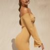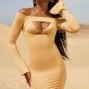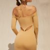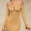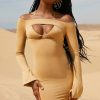 Dance til dawn in Warm Sands, a mini dress with off the shoulder styling and a bralet underlay with self tie at the neck. Made with a curve-loving bodycon fit, the long sleeves are slit at the hems to create a slight flare. The dress is complete with a thong detail to the rear. Style yours with a fedora and western boots.