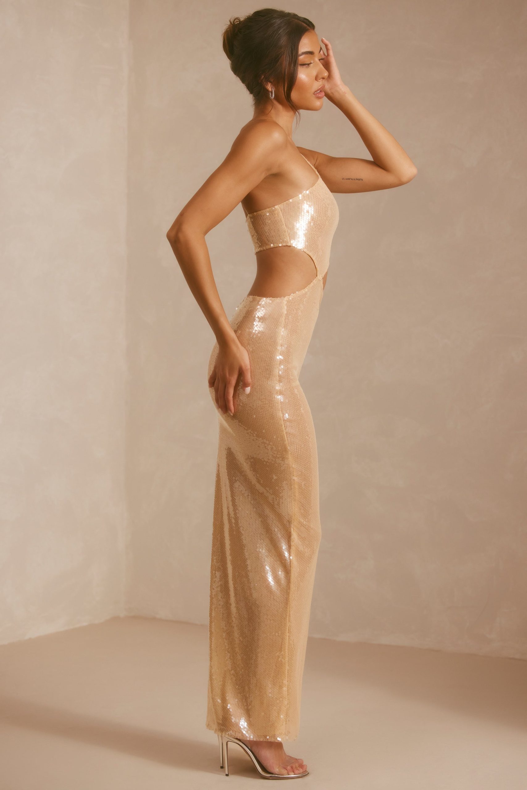 Glittering evenings with Isabel. Designed in our sequin embellished, dual lined power mesh fabric and ready to elevate your summer evening plans. The Isabel maxi dress features a sleek asymmetric neckline, statement cut-out detailing at the waist and a raw edge hem.