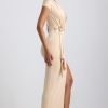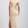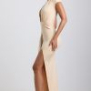 Slinky silhouettes amplified with unique elements. The ideal complement to dinner dates and tropical getaways alike, the Amalda dress is cut from our signature jersey fabric to a maxi silhouette with a striking thigh-high front split. It’s framed with a plunging neckline and short cap sleeves, while the waterfall ruffle trim at the waist is secured with custom-developed metal hardware, creating a cinched look.