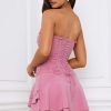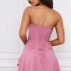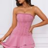 Dress up. A romantic style made for evening plans, the Philomena mini dress is crafted from lightweight stretch georgette and premium sheer jersey with a corseted bodice for enhanced shape and structure. The drop-waist silhouette is elevated with ruched detailing and falls to a ruffled tiered skirt. It’s complete with a signature lace-up back with a tonal detachable panel that creates an open-back look.
