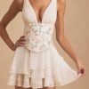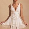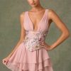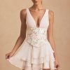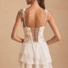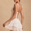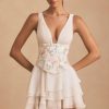 Pretty florals meet unique construction with the Sakura mini dress. Crafted from layers of lightweight chiffon with a plunging neckline and dynamic tiered skirt, it’s overlaid with a waist-cinching corset crafted from mesh and decorated with custom floral appliqués and sparkling embellishments that coordinate perfectly. It’s complete with a signature lace-up back and adjustable rouleau straps for a custom fit.