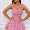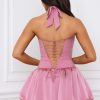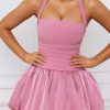 Playful silhouettes for memorable nights. The Ludmila mini dress is crafted from sumptuous georgette and satin to a structured bubble hem silhouette, complete with matching jersey shorts to temper the micro mini length. It’s framed with an adjustable halterneck for a supportive fit and is complete with corset-inspired lace-up detailing at the back.