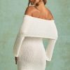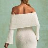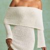 The forecast: hot. Made for warm-weather styling from day to night, the Souline mini dress is crafted from lightly textured and subtly sheer bouclé knit fabric made with cotton and a touch of stretch for a figure-skimming fit. It’s cut to an off-shoulder silhouette with an exaggerated foldover panel and flared long sleeves.