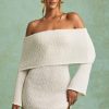 The forecast: hot. Made for warm-weather styling from day to night, the Souline mini dress is crafted from lightly textured and subtly sheer bouclé knit fabric made with cotton and a touch of stretch for a figure-skimming fit. It’s cut to an off-shoulder silhouette with an exaggerated foldover panel and flared long sleeves.