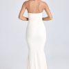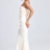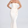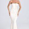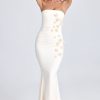 Pretty florals. Inspired by the beauty of botanical gardens in high summer, the Aveline maxi dress is traced with hand-applied floral appliqués that highlight the sculpting fishtail silhouette. Crafted from lightweight georgette that hugs your curves, it’s rendered in two timeless hues and enhanced with perfectly placed ruching at the sides. The slender adjustable straps can be removed for multiple styling options.