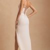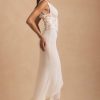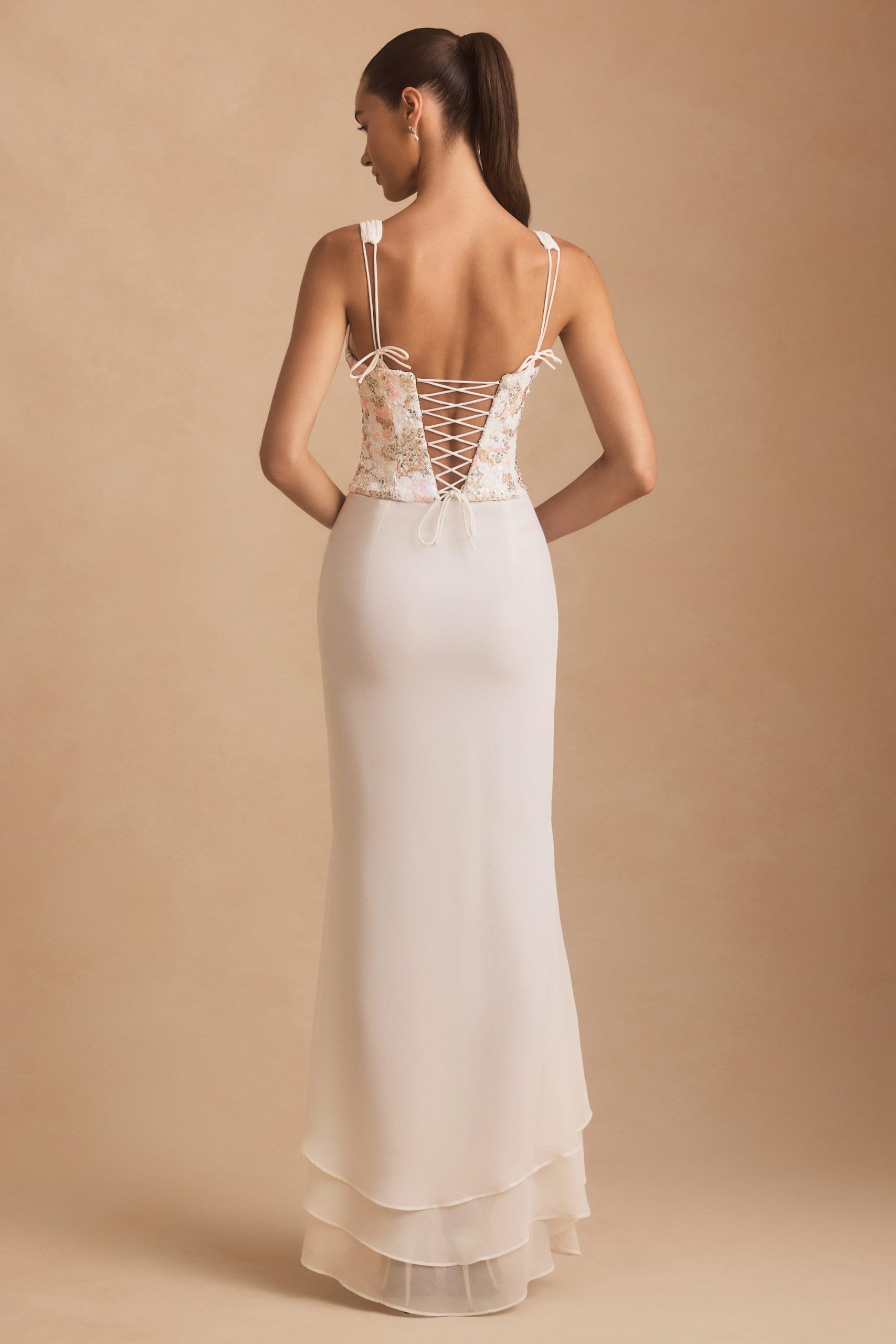 Worth making plans for, the Nathalia maxi dress is cut from lightweight chiffon with a plunging V-neckline, waterfall split hem and statement lace-up back. It’s overlaid with a waist-cinching corset decorated with coral-inspired embellishments that sparkle under spotlights. The rouleau straps are fully adjustable for your perfect fit.
