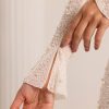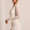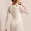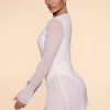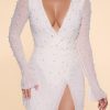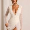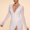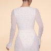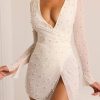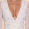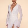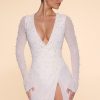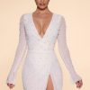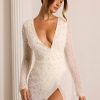 Designed with an undeniably flattering wrap over neckline that exposes a flirtatious amount of skin, the Chelsea mini dress features a heart stopping a-line skirt with full split that exposes your left leg. Fully embellished with pearl and bead adornment and complete with a semi sheer mini skirt and split flare sleeves, Chelsea is all about the finer details. Complete with a built in bodysuit, Chelsea is the ultimate party dress for your most premium events this season.