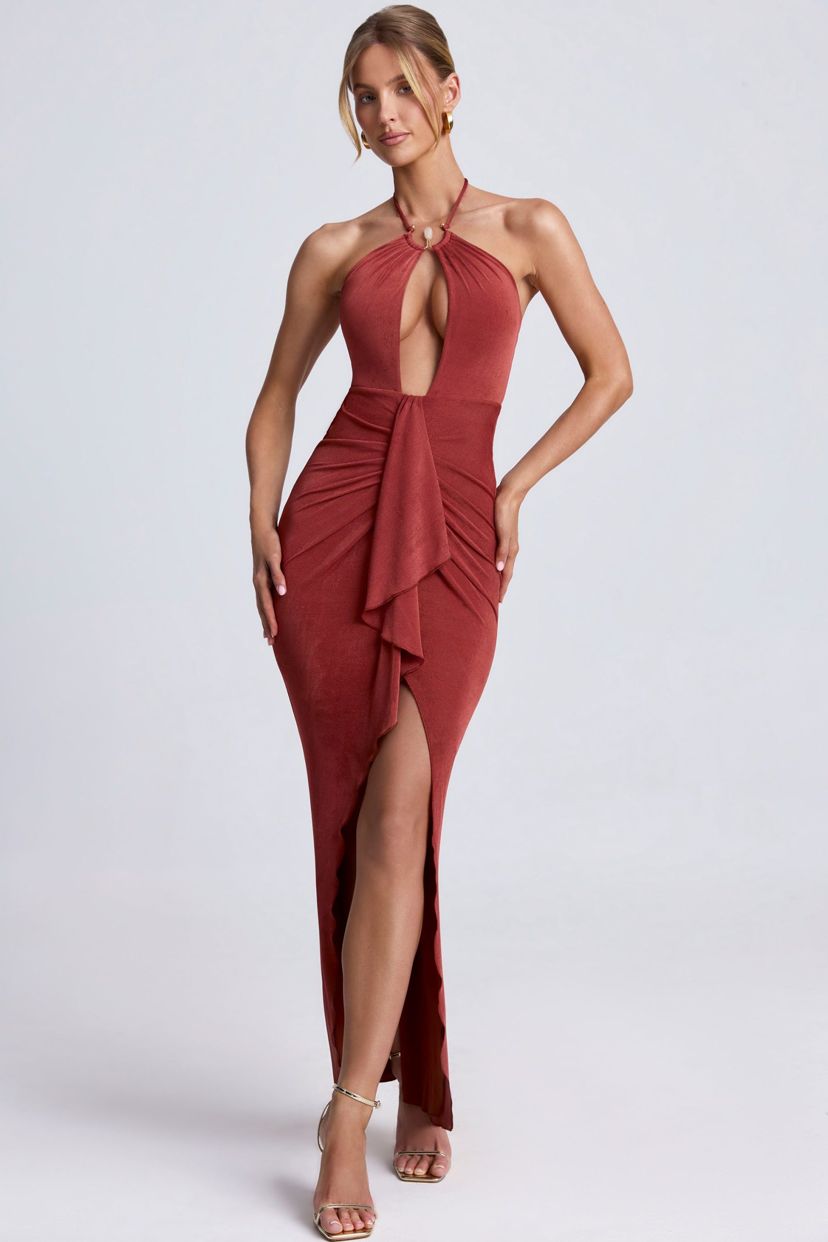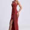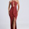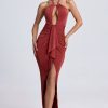 Perfect for sunset drinks and endless dinner dates, the Margot dress is rendered in two enduring hues. It’s crafted from lightweight textured jersey to a column silhouette with a halter neckline adorned with custom-developed hardware and falls to a maxi-length skirt punctuated with a thigh-high split. It’s complete with a statement cut-out at the front, figure-flattering ruching and a cascading waterfall trim.
