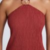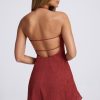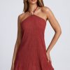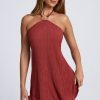 An elevated take on destination dressing. A lightweight and laid-back style that’ll suit day-to-night plans, the Evalina mini dress is cut from plissé jersey with a wired hem that creates a floaty silhouette. The halter neckline is anchored with custom-developed hardware, centred with a single lustrous gemstone for a statement finish, and turns to reveal a curved open back with adjustable straps.