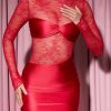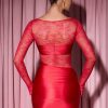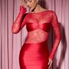 Long-Sleeve Lace-Panel Draped Bodycon Mini Dress in Red