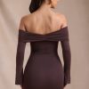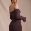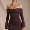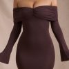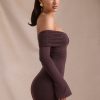 Modal-Cashmere Blend Off-Shoulder Ruched Mini Dress in Espresso