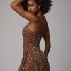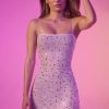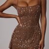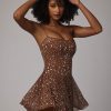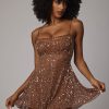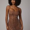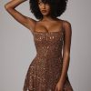 Sheer Embellished Scoop Neck Mini Dress in Mocha