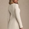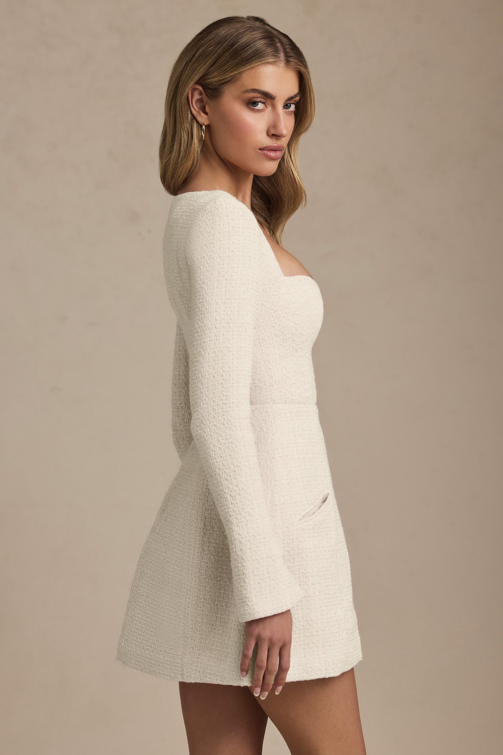 Perfect structure. An instant favourite, the Tacita mini dress is crafted from premium textured tweed to a structured silhouette with a waist-defining bodice and exaggerated tulip skirt that holds its shape. It’s framed with a delicate sweetheart neckline, long flared sleeves with split cuffs, and two slip pockets that cement the classic tailored aesthetic.